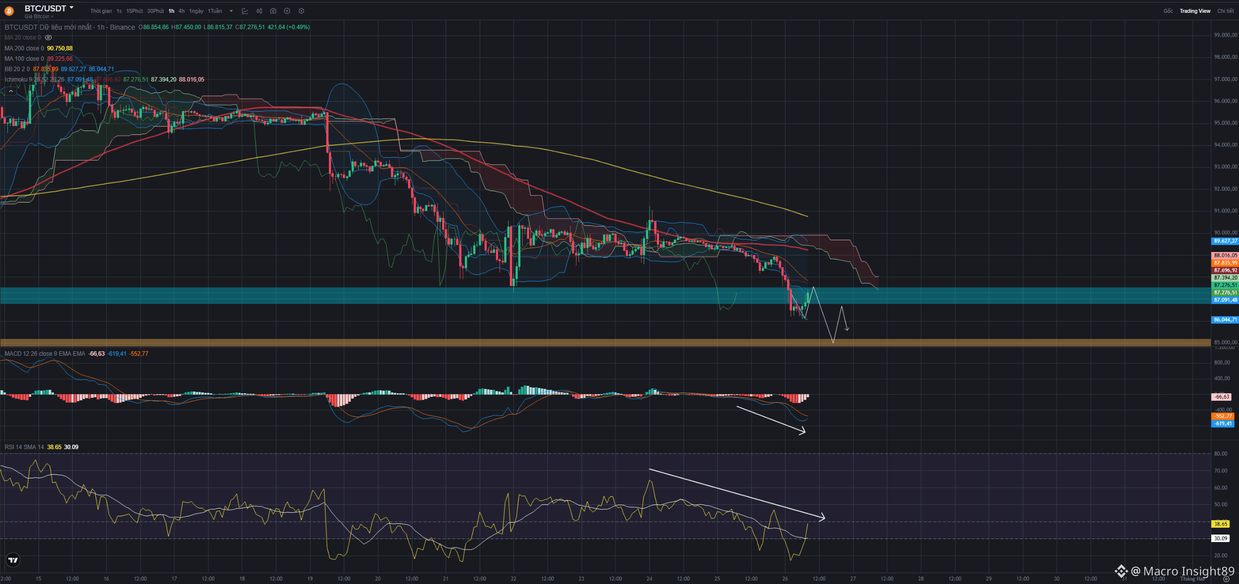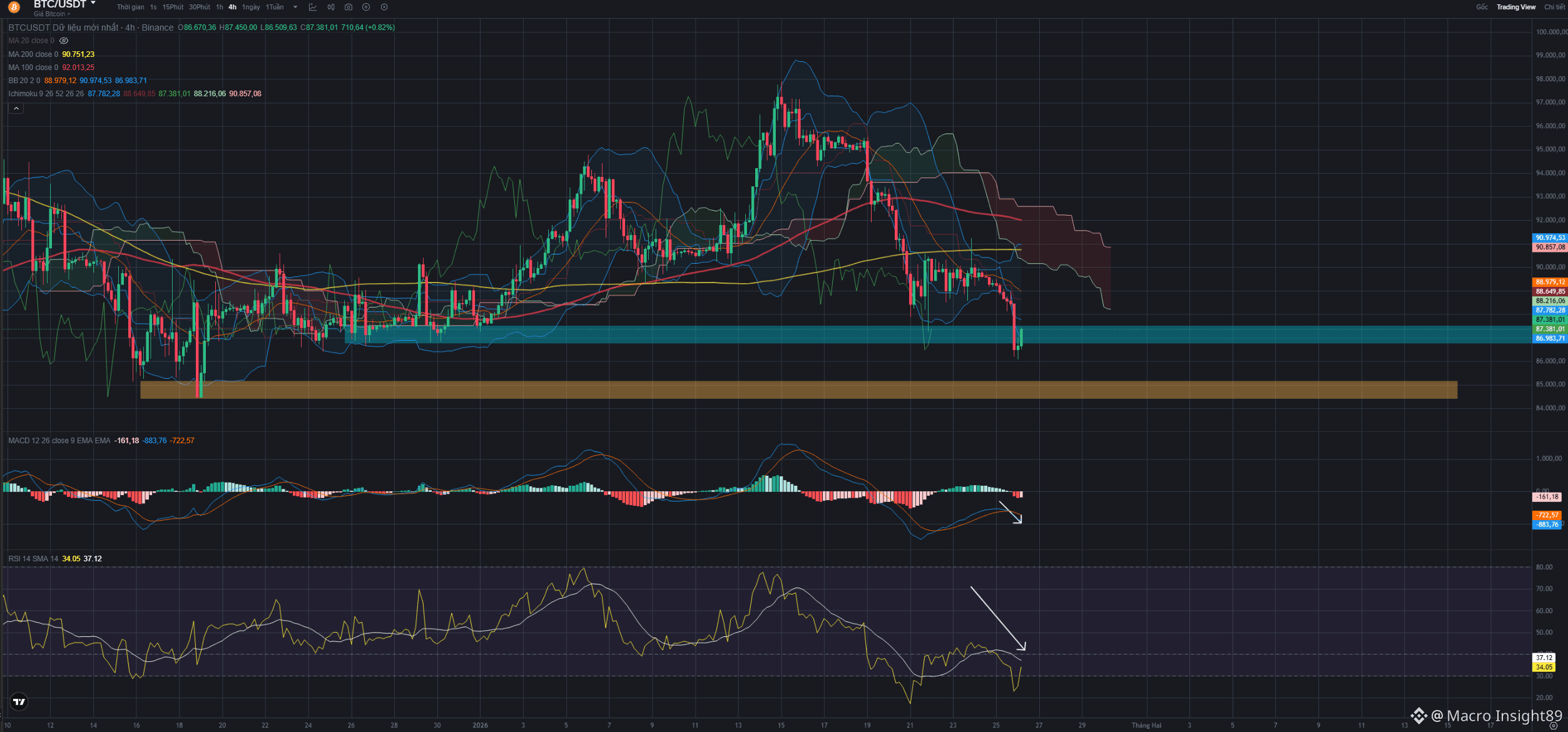 Còn BTC khung 4H thì xu hướng tổng thể vẫn đang là giảm – hồi trong downtrend, chưa có tín hiệu đảo chiều đáng tin. Giá hiện nằm dưới mây Ichimoku, dưới MA200, cấu trúc vẫn là lower high – lower low, cho thấy phe bán còn kiểm soát. Vùng 87k–87.5k đúng là support quan trọng, đã có phản ứng bật nhẹ nhưng lực cầu yếu, nến hồi ngắn và chưa rút râu lại các MA hay cạnh dưới mây nên chỉ xem là hồi kỹ thuật chứ chưa phải đáy. MACD vẫn dưới 0, histogram âm và chỉ mới có dấu hiệu chậm lại, RSI quanh 30–35, quá bán nhẹ nhưng chưa có phân kỳ tăng rõ ràng trên 4H.