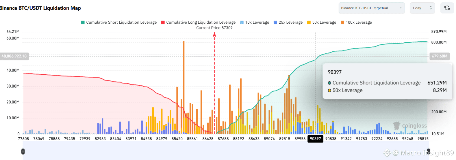BTC Liquidation thì đang thiên về 1 kịch bản Short ngắn rồi Long lên để kill 2 đầu vì tỷ lệ SHORT đang chiếm ưu thế, như trong hình nếu BTC kéo lên 90k4 thôi thì tới 650M sẽ bị thanh lý.