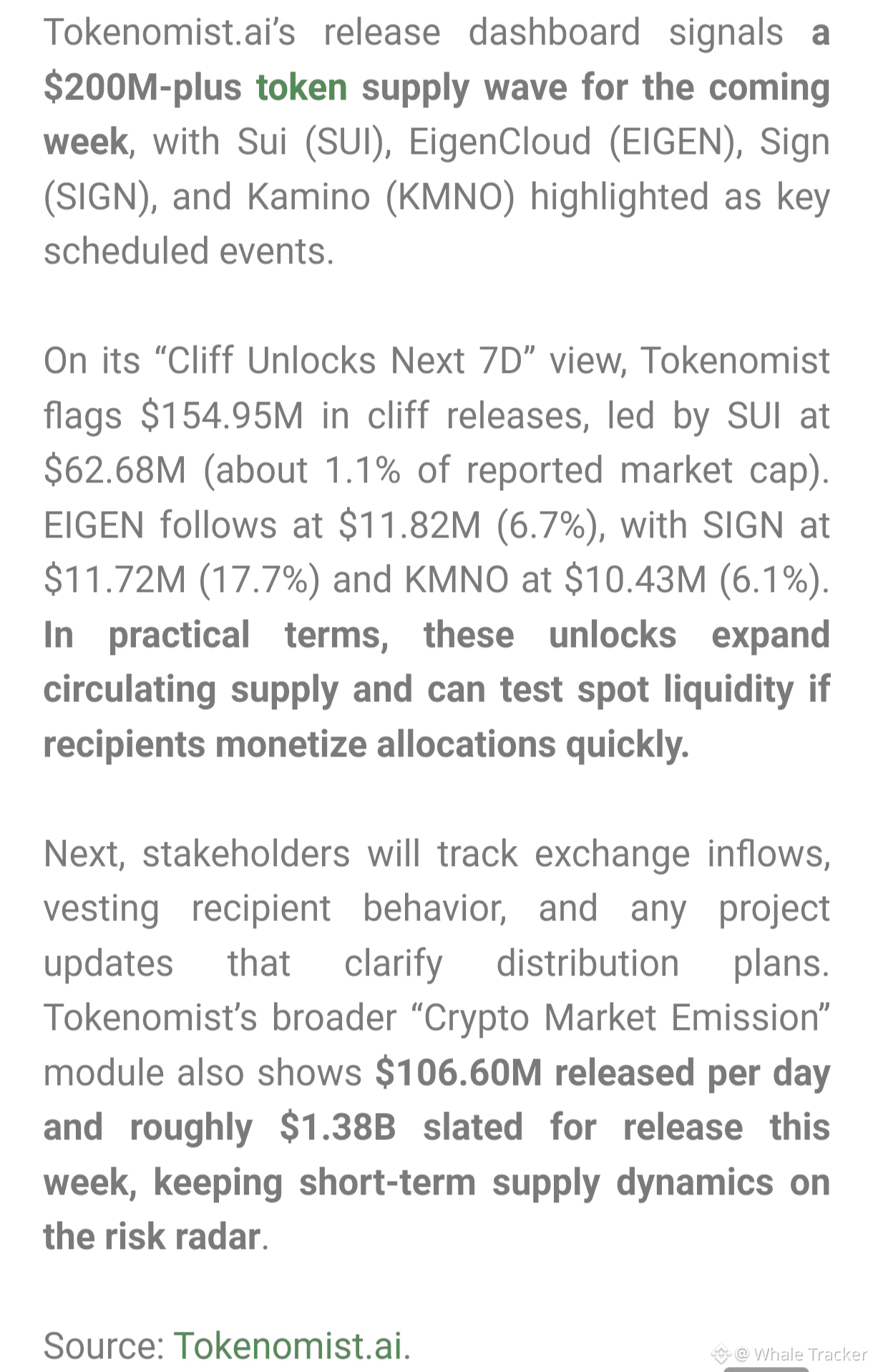 A major token unlock wave is set for this week, with over $200 million worth of tokens scheduled to enter circulation, according to Tokenomist.ai. The largest unlocks involve SUI, EIGEN, SIGN, and KMNO, raising short-term supply and potential sell-pressure concerns.