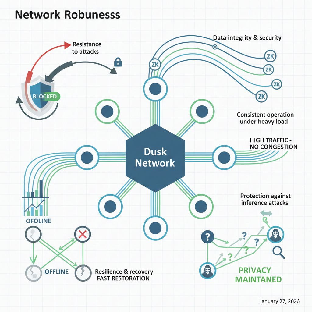 Network robustness is not just a technical convenience—it is privacy infrastructure. By ensuring continuous operation, data integrity, and resilience against attacks, Dusk Network creates a privacy-preserving environment capable of withstanding high traffic, targeted attacks, and emerging threats. In AI-driven or high-load environments, such robustness is the difference between theoretical privacy and actionable confidentiality.