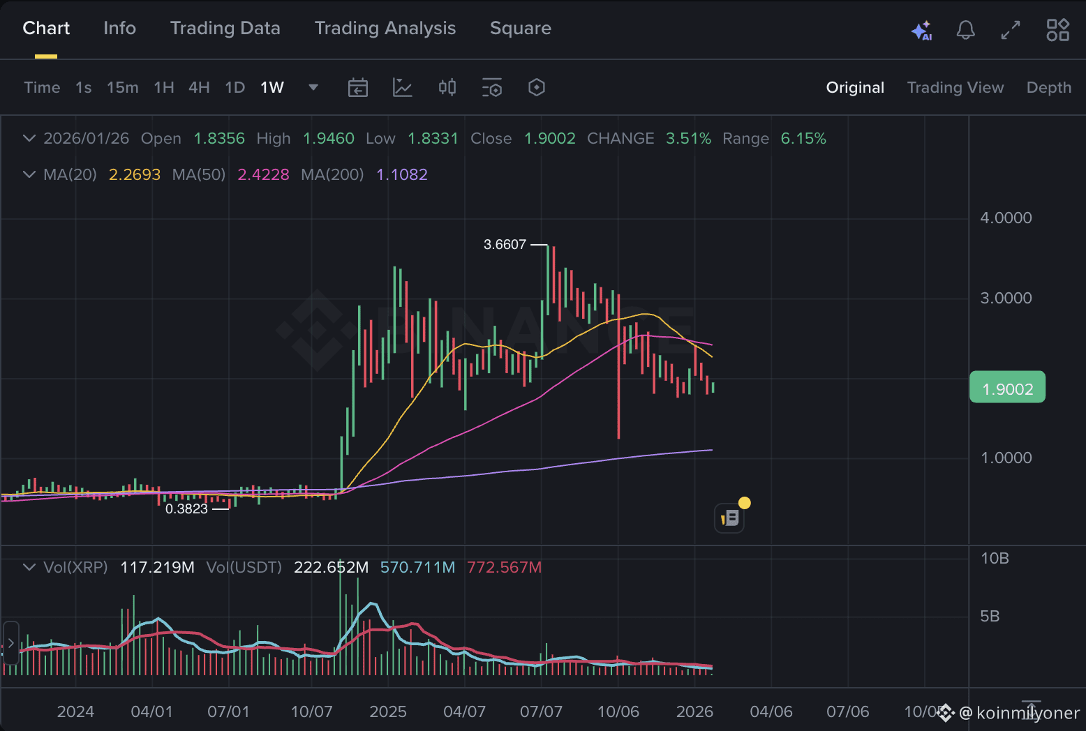At the time of writing, XRP is trading at $1.91 and just bounced off the $1.81 dip. If it continues this bounce, $2.00 and $2.25 are the first psychological resistance levels. Breaking above those levels would confirm a bullish shift.