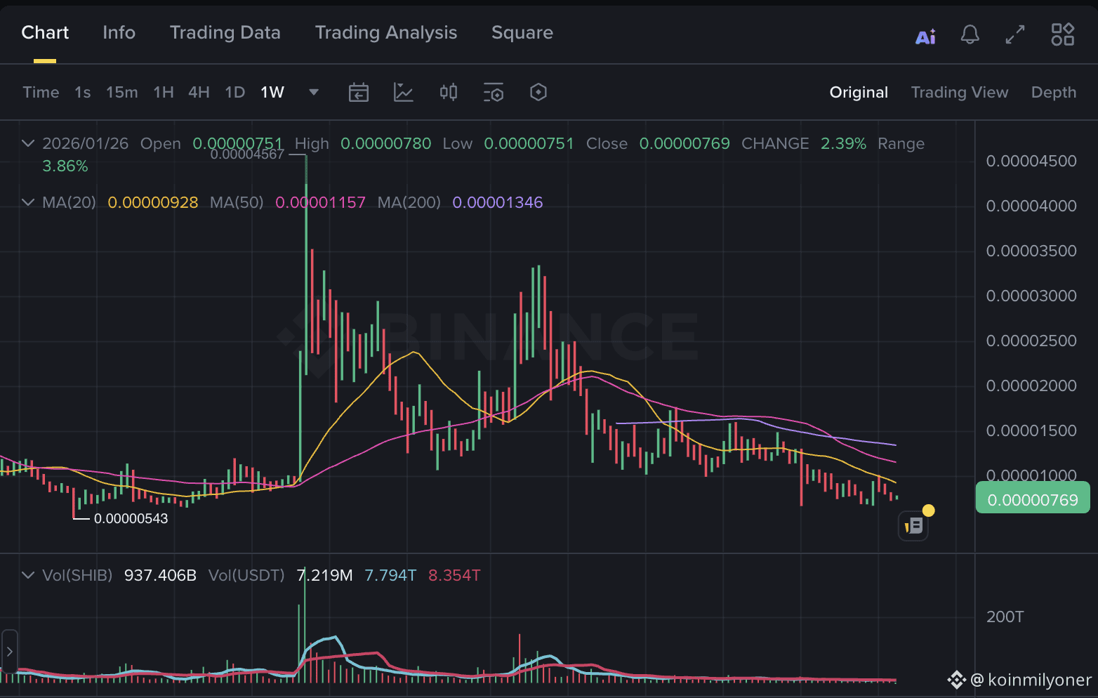 The Shiba Inu chart is basically a clean descending channel that has been respected for a long time, with lower highs and lower lows grinding price down in a very orderly way.