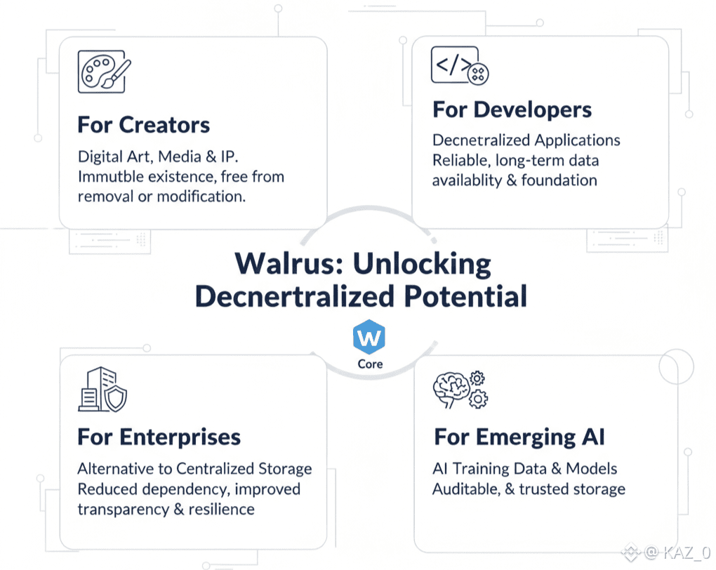 Walrus opens doors across multiple worlds. For creators, it means digital art, media, and intellectual property can exist without fear of removal or silent modification. For developers, it offers a foundation for decentralized applications that need reliable, long-term data availability. For enterprises, it provides an alternative to fragile centralized storage, reducing dependency while improving transparency. For emerging AI systems, Walrus offers a way to store and verify training data and models in a way that can be audited and trusted.