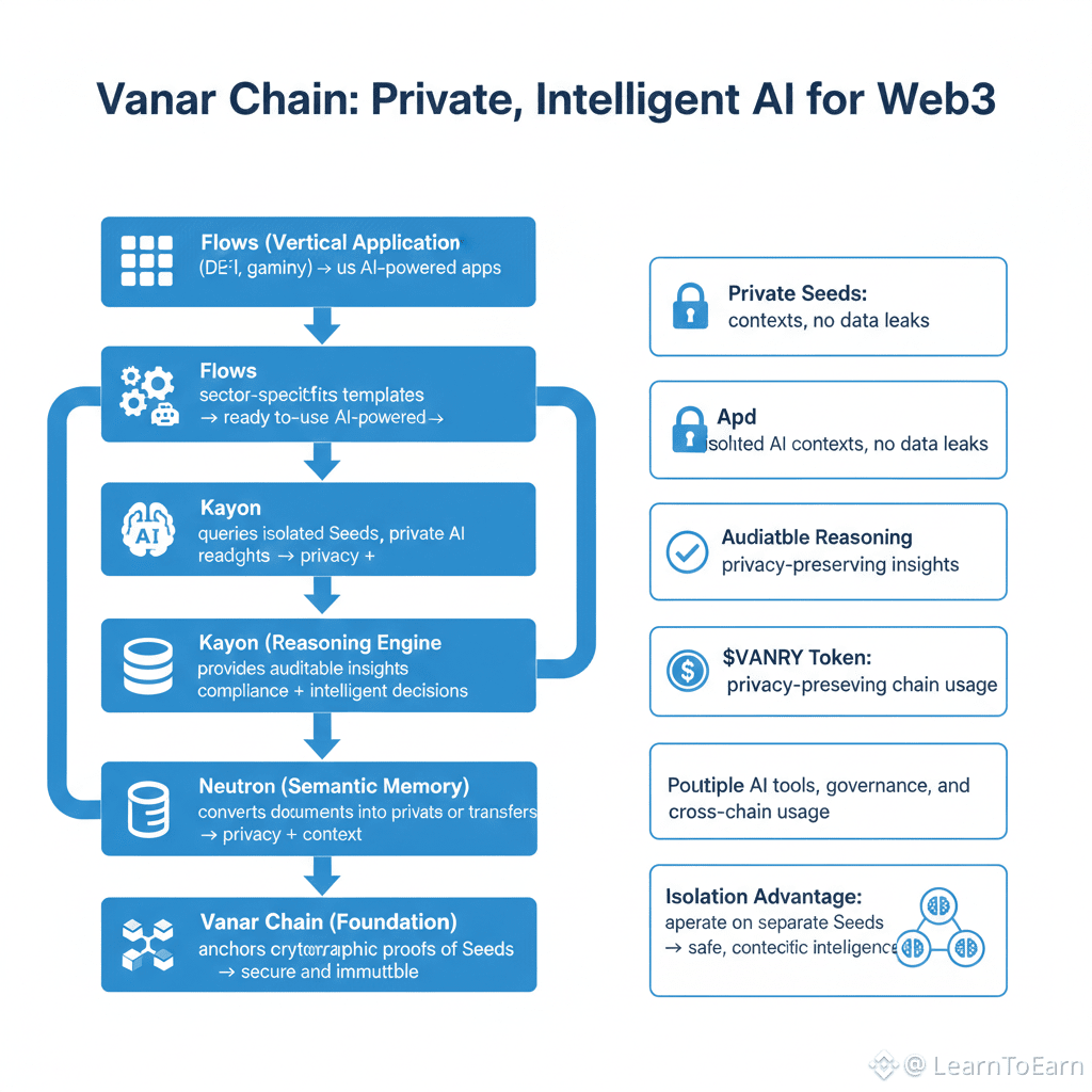 Vanar Chain provides an alternative. Its AI-native architecture embeds privacy and intelligence at the foundational level, avoiding the vulnerabilities of retrofit approaches. Sensitive data is transformed into encrypted, structured “Seeds” by Neutron. Only minimal cryptographic proofs anchor on-chain, while AI reasoning occurs in isolated, permissioned contexts via Kayon. Context isolation ensures each application, user, or enterprise operates within its own semantic environment, eliminating cross-context leakage. Compliance-by-design is built directly into Flows, with pre-configured rules for regulatory standards, data sovereignty, and governance.