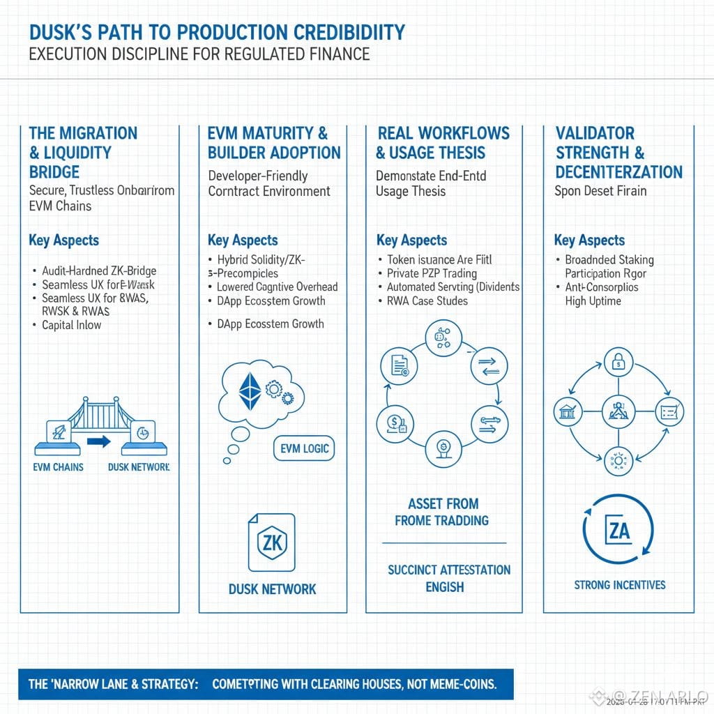From here, what matters most is execution with discipline. The bridge and migration path needs to return in a stronger state because it is essential for liquidity and onboarding. The EVM environment needs to keep maturing because it is the practical surface most builders will use. The regulated asset stack needs to show more real workflows, not just standards, so the thesis becomes visible through usage. And the network needs to keep strengthening decentralization and staking participation, because settlement credibility is only as strong as the validator incentives and the rigor of the system.