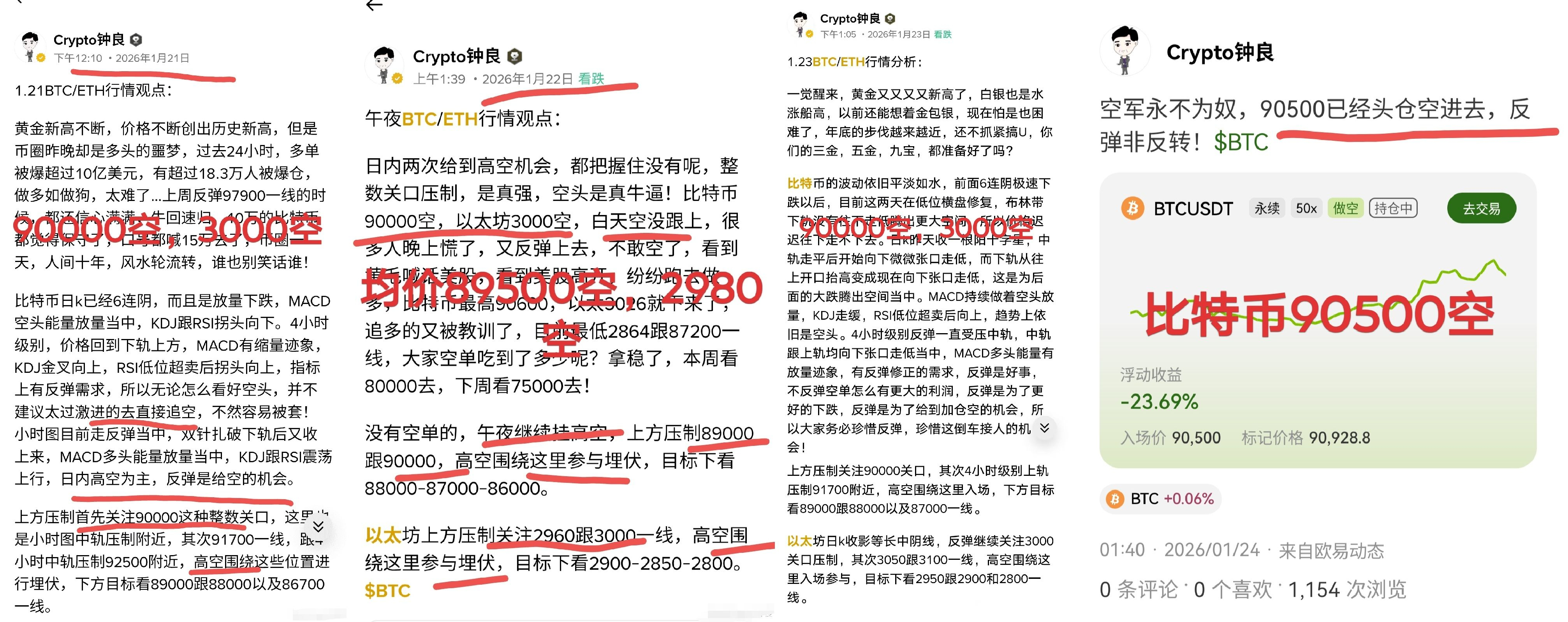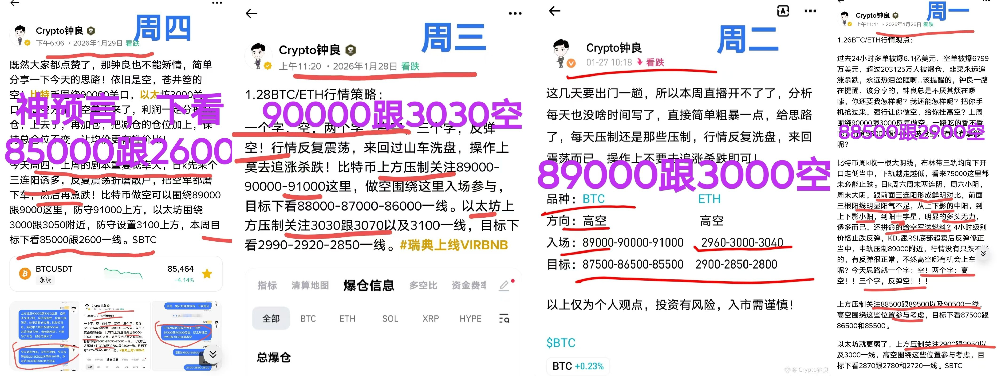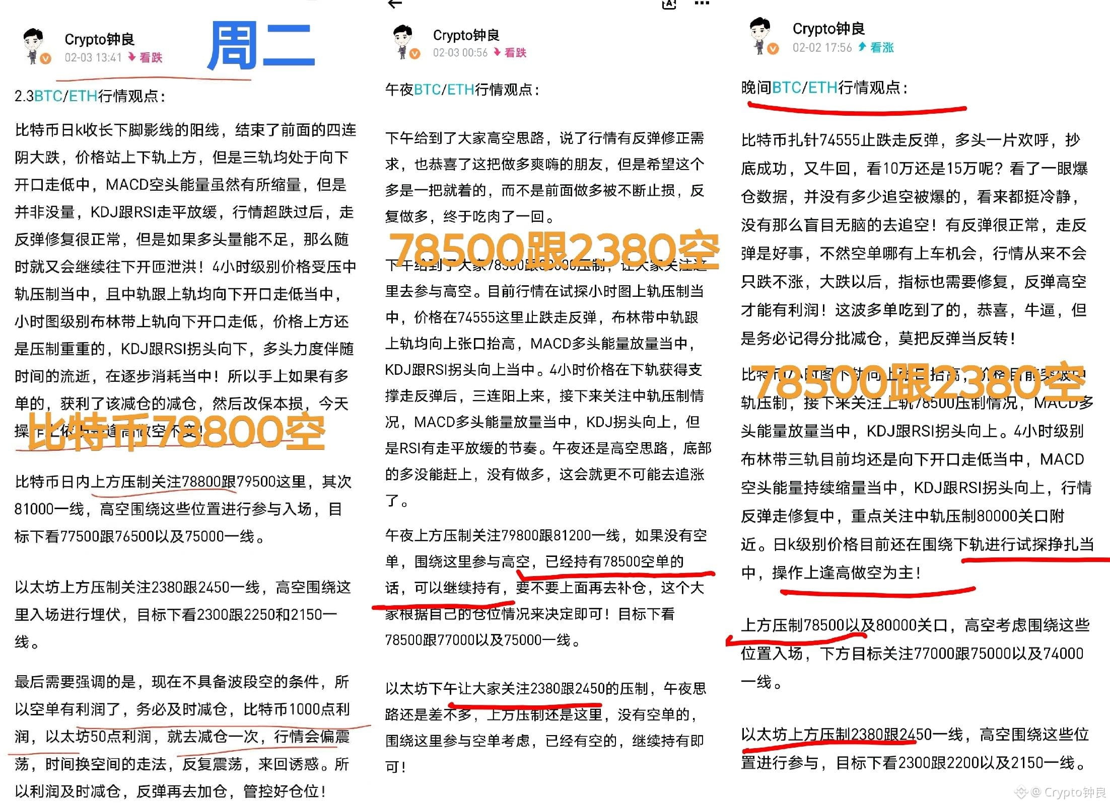 良言难劝该死的鬼,钟良从94000让波段空,说了拿75000去,反弹78000让没波段空的,可以继续,是不是全网公开,每天在强调呢?上周,上上周,反复让大家围绕90000跟3000关口去不断做空,短线也是每天都吃的够够的吧!本周,昨天周二,比特币让78800空,最低下跌72899一线,将近6000个点跌幅,前天周一让78500空,以太坊2380空,昨晚最低2103,这些空单,只要跟上,随便都是翻仓的节奏吧!