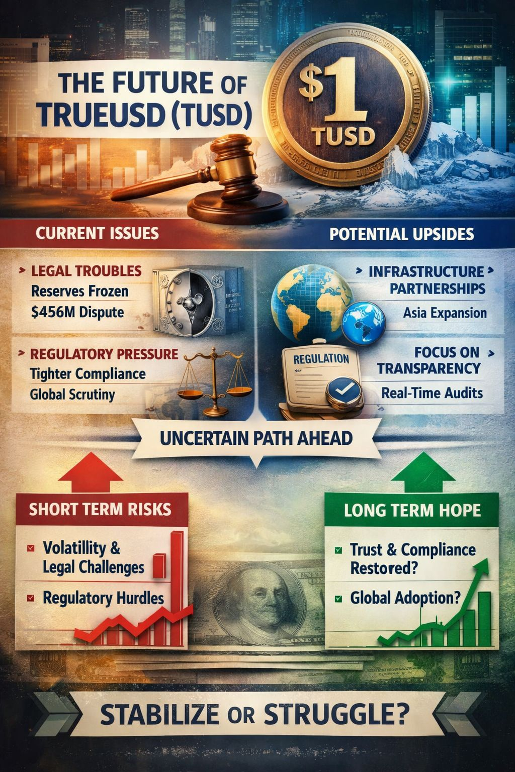 TrueUSD’s future is not dead, but it’s heavily contingent on legal resolution, regulatory compliance, and transparency execution. If TUSD can stabilize confidence and address reserve concerns, it may remain a relevant stablecoin, especially in DeFi and payments. Otherwise, it risks being overshadowed by larger, more trusted alternatives. �