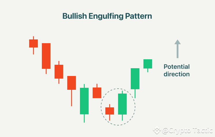 The bullish engulfing pattern is formed of two candlesticks. The first candle is a short red body that is completely engulfed by a larger green candle.