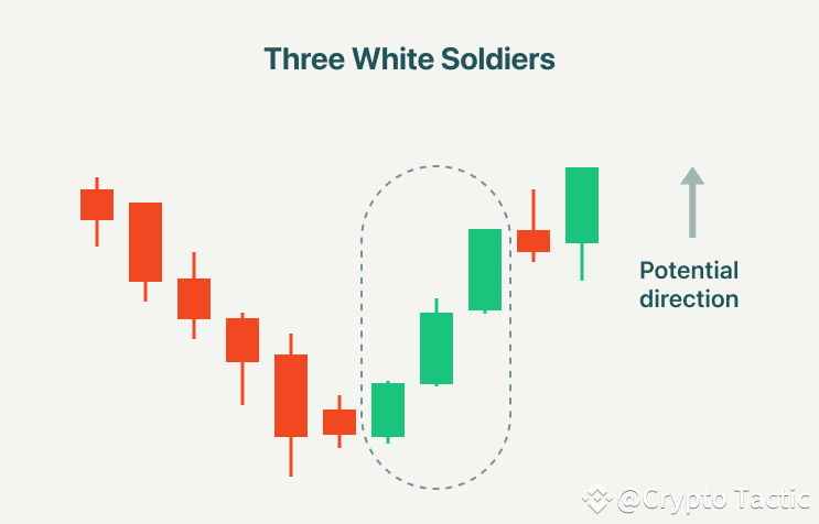 The three white soldiers pattern occurs over three days. It consists of consecutive long green candles with small shadows, which open and close progressively higher than the previous day.