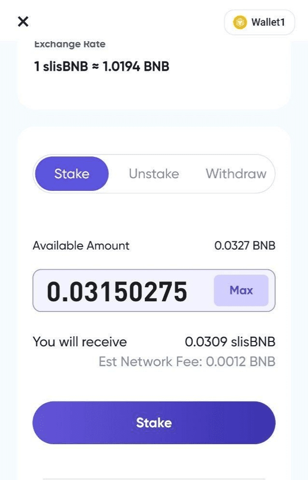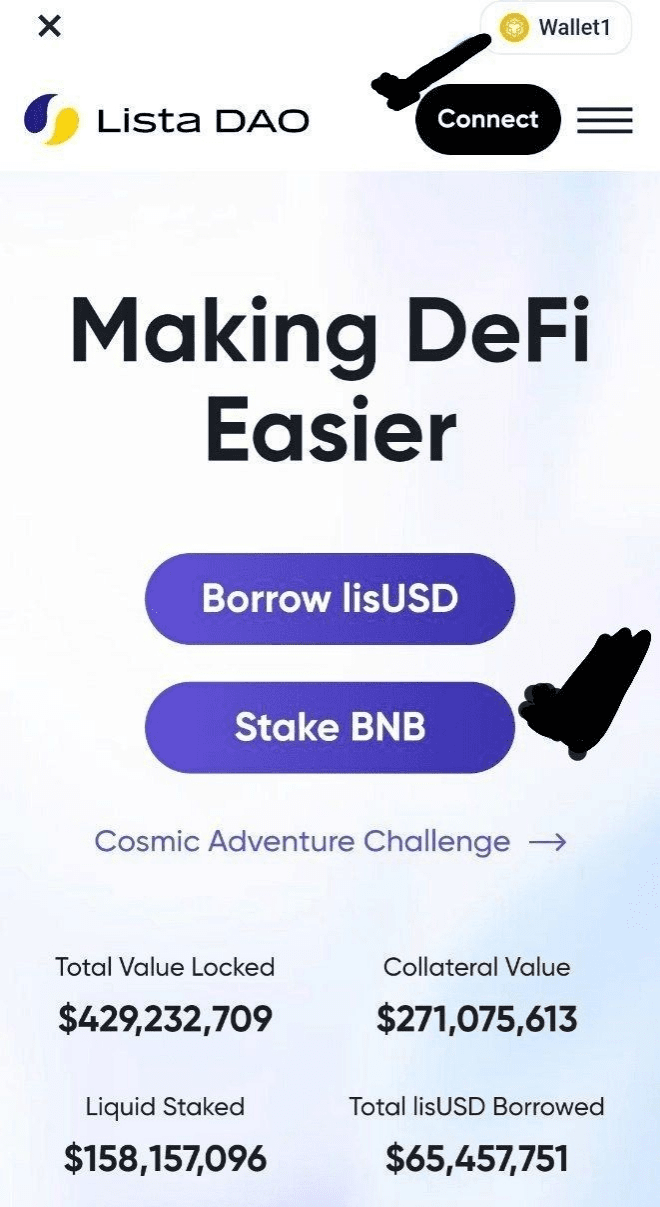 Start by linking your wallet when you start using the dApp and then proceed to stake BNB.