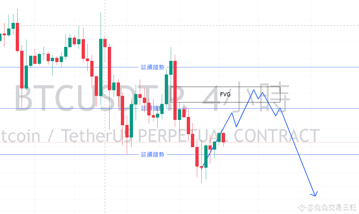同時出現了失衡區,等待價格填補後,如後續小週期繼續出現下行結構反轉,則進場做空,止損暫時設置失衡區上緣。