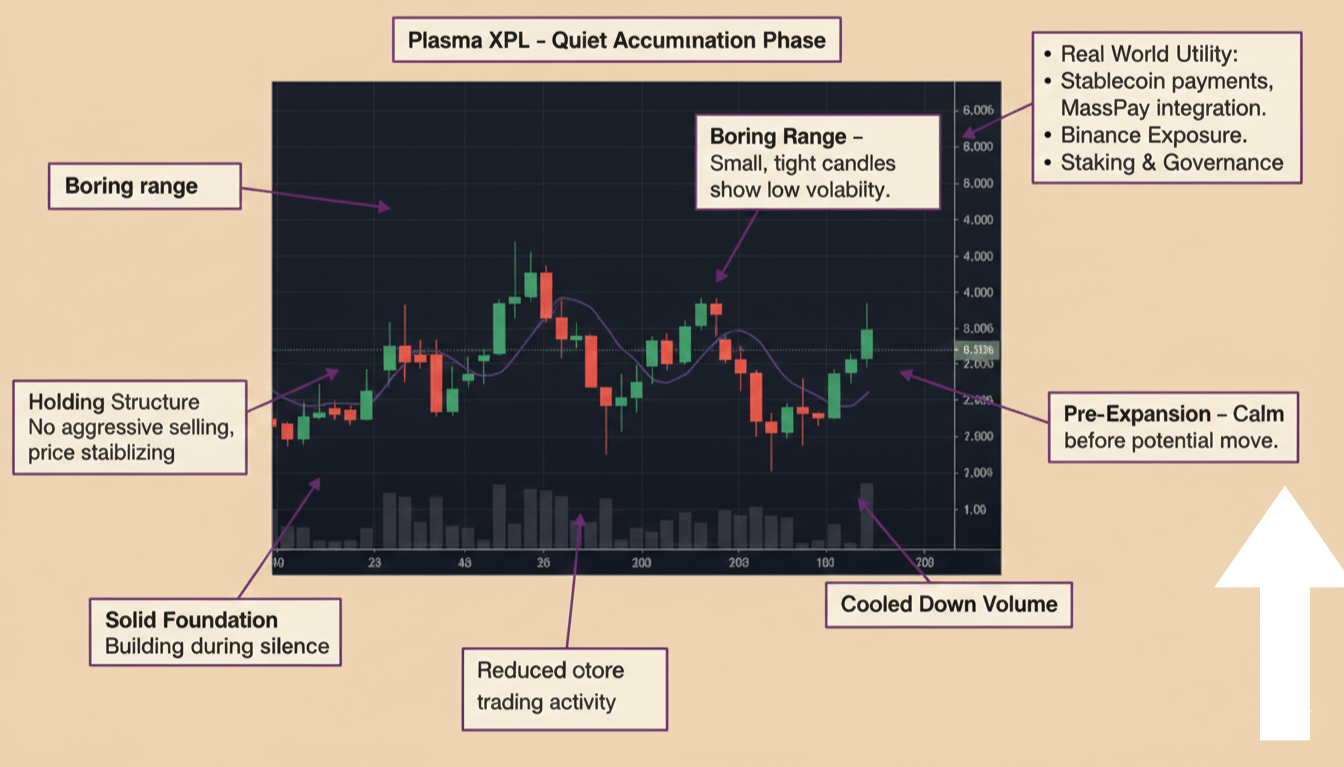 Right now XPL feels like it is sitting in that silent zone markets usually enter before something changes. The candles are not exciting. Volume has cooled down. Social media noise is lower. On the surface it looks like nothing is happening. But when you slow down and really study the structure it tells a different story.
