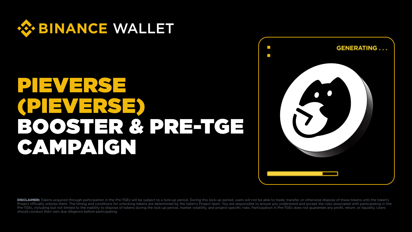 PIEVERSE tokens are Pre-TGE tokens which will be subject to a lock-up period and will NOT be available for claiming or trading after allocation until a decision to unlock from the project. Read our FAQs carefully for more information.