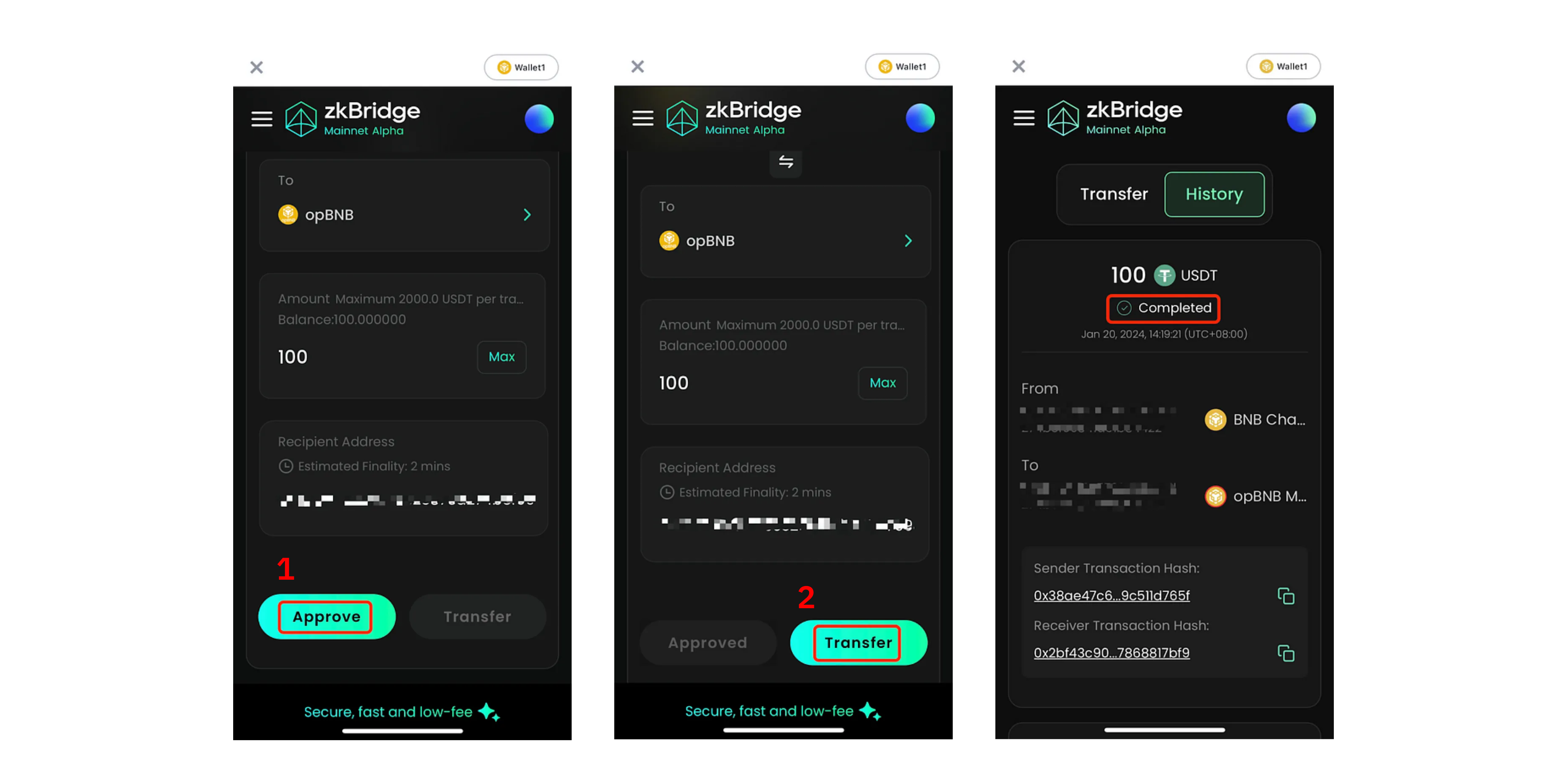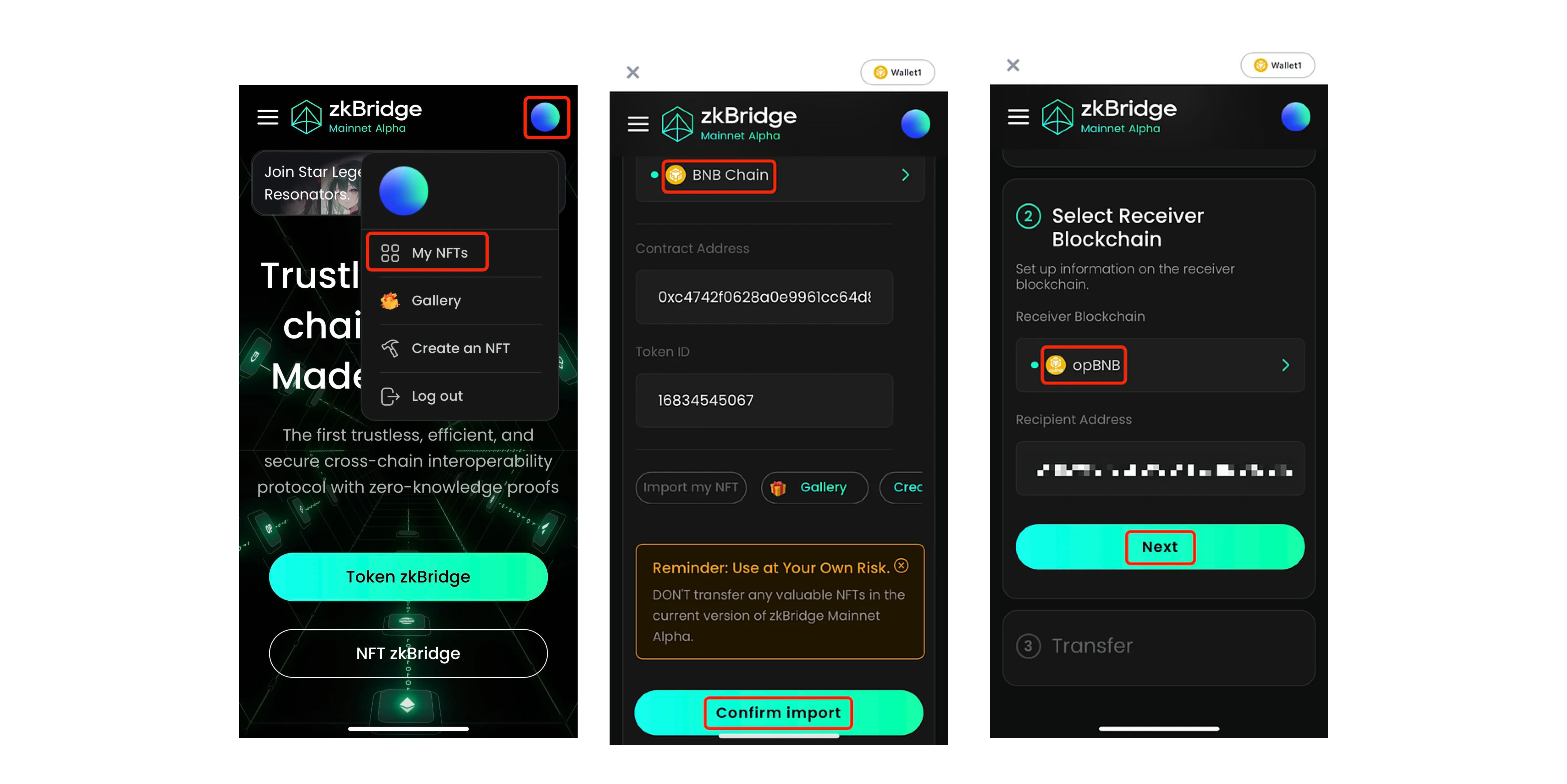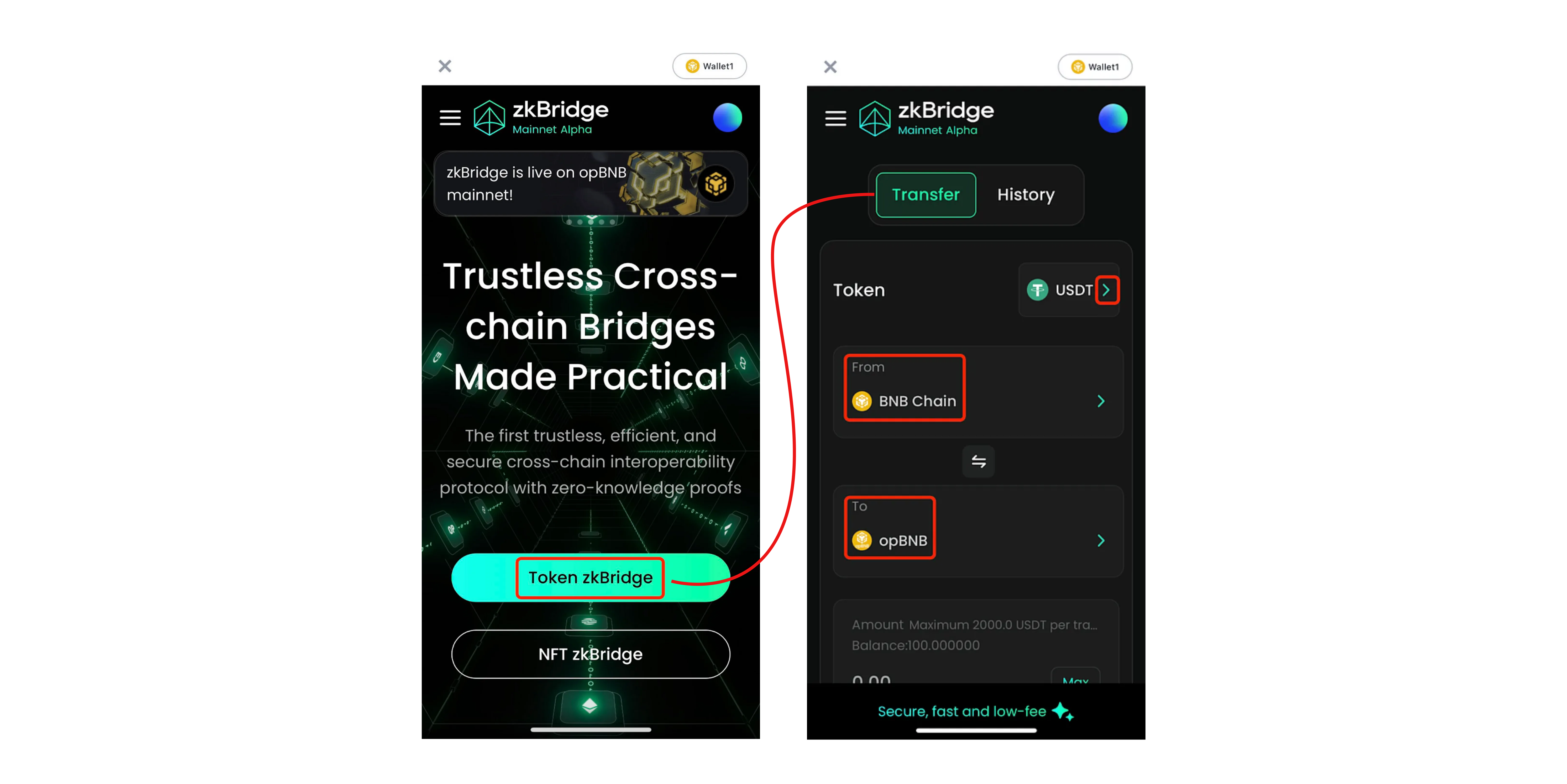 Transfer funds between networks using the zkBridge Dapp.
