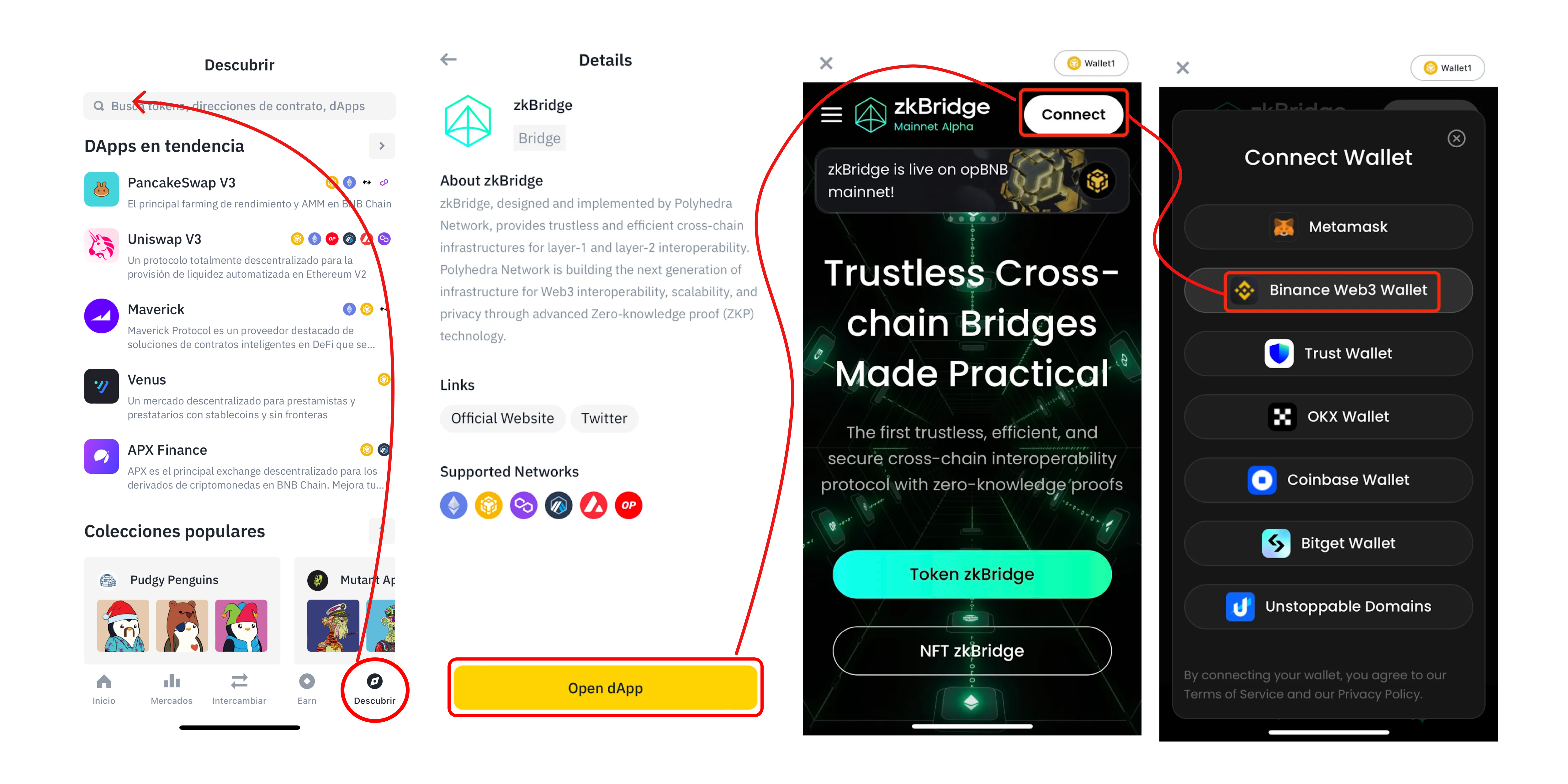 Open the ZKBridge Dapp and connect your Binance Wallet with the 'BINANCE WEB3 WALLET' button to start trading.