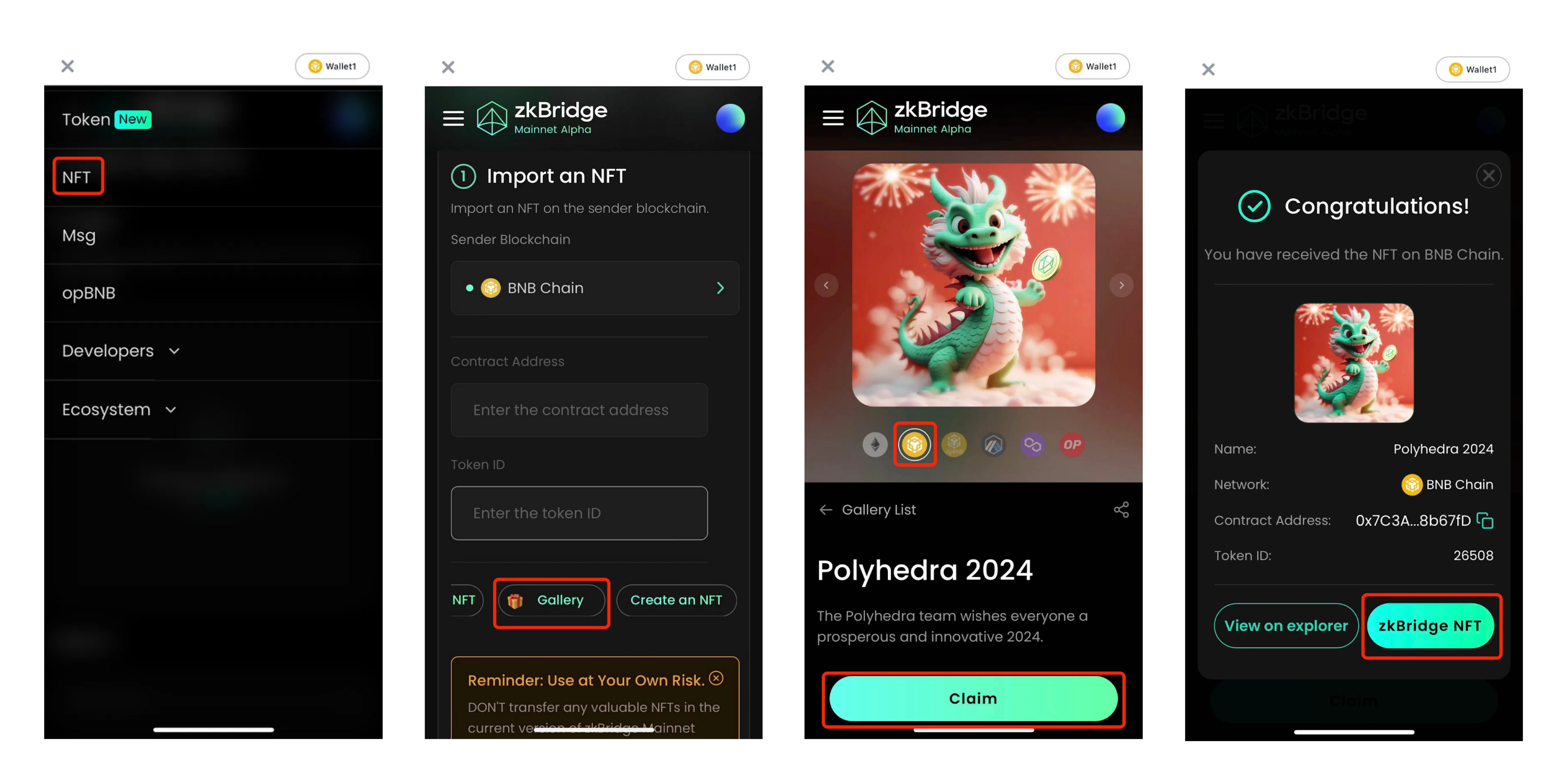 Within the 'ZKBRIDGE' Dapp, open the drop down menu and go to the NFT section.