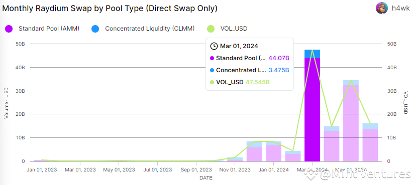 This is further evidenced by Raydium’s trading data, which shows that 94.3% of its trading volume stems from standard pools, largely driven by memecoins.