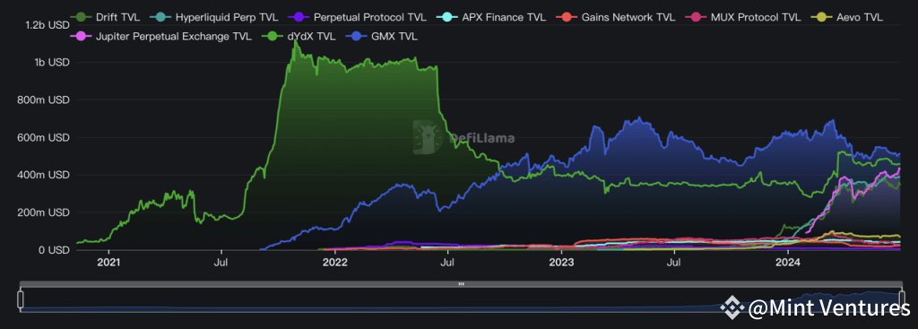 GMX currently holds a leading position in terms of TVL. Nonetheless, other significant players in the space, such as the established derivatives protocol dYdX, Jupiter Perp with its substantial traffic gateway on Solana, and the forthcoming Hyperliquid, are also showcasing TVL figures that are comparable to GMX’s.