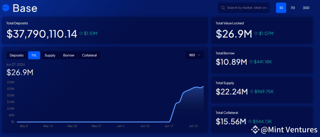 Its expansion on Base has been particularly swift, achieving a TVL of $27 million in less than two months, while Aave’s TVL on Base stands at approximately $59 million.