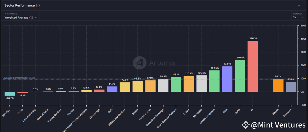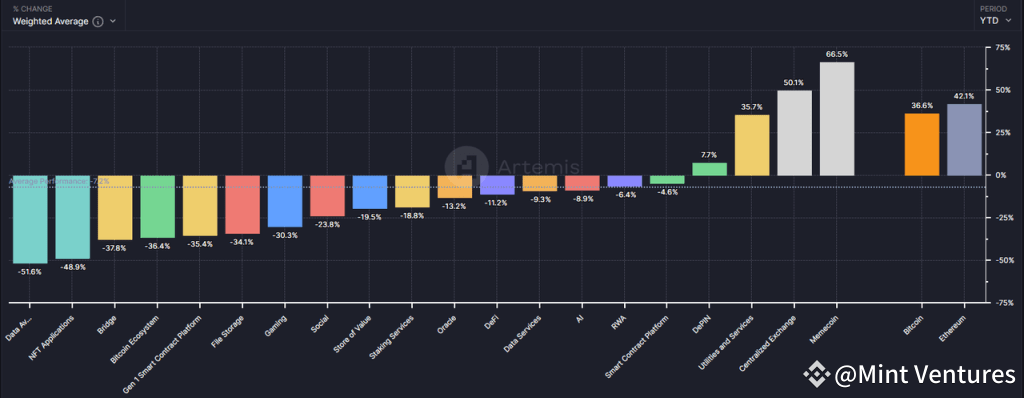 The combination of weak demand and narratives, along with over-issuance on the supply side, is an unprecedented situation in the crypto cycle. Despite manual efforts to sustain valuations by further reducing the token circulation ratio at the time of listing – from 41.2% in 2022 to 12.3% in 2024 – and gradually selling to secondary investors, the convergence of these factors has led to an overall downward shift in the valuation of these crypto projects. In 2024, only a few concepts, such as Memecoins, CEX, and DePIN, have managed to maintain positive returns.