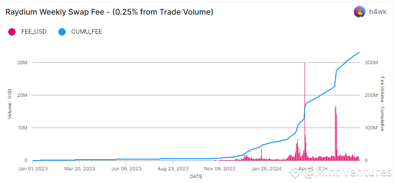 Regarding swap fees, Raydium accrued about $300 million in the first half of 2024, which is 9.3 times the fees it collected throughout all of 2023.