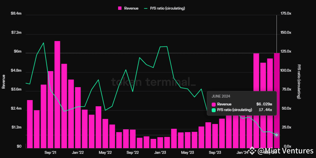 Take the lending protocol Aave as an example. While its quarterly revenues (referring to net income, not overall agreement fees) have surpassed the highs of the last cycle and hit all-time highs, its PS ratio (circulating market cap/annualized revenue) has hit an all-time low and is currently at just 17.4x.