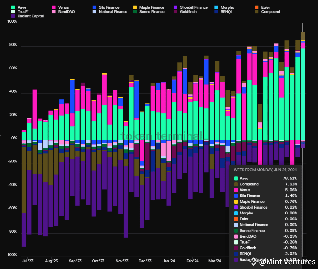 Another vital metric is the protocol’s profitability or its profit margins. Here, profits are calculated as the protocol’s revenue minus token incentives. As illustrated in the subsequent graph, Aave’s protocol profitability has distanced itself from other lending protocols. Aave effectively abandoned the Ponzi model of relying on token subsidies to fuel operations, a strategy still employed by others such as Radiant (indicated by the purple segment in the chart).