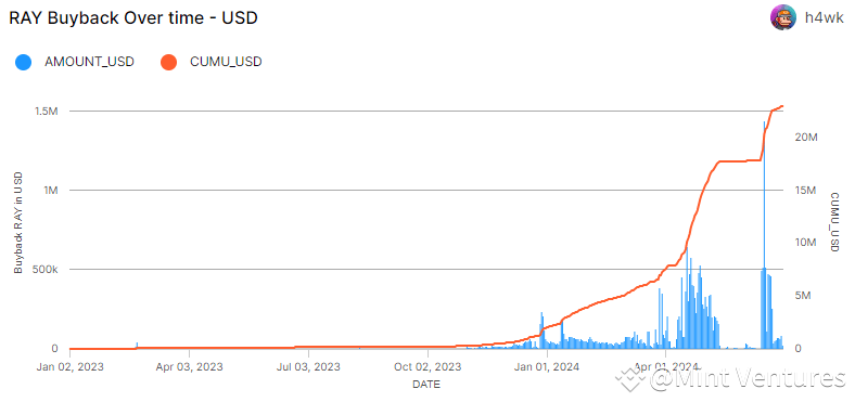 In the first half of 2024, Raydium used about $20.98 million of its protocol revenue to buy back $Ray tokens, an amount 10.5 times the total spent on buybacks in 2023.