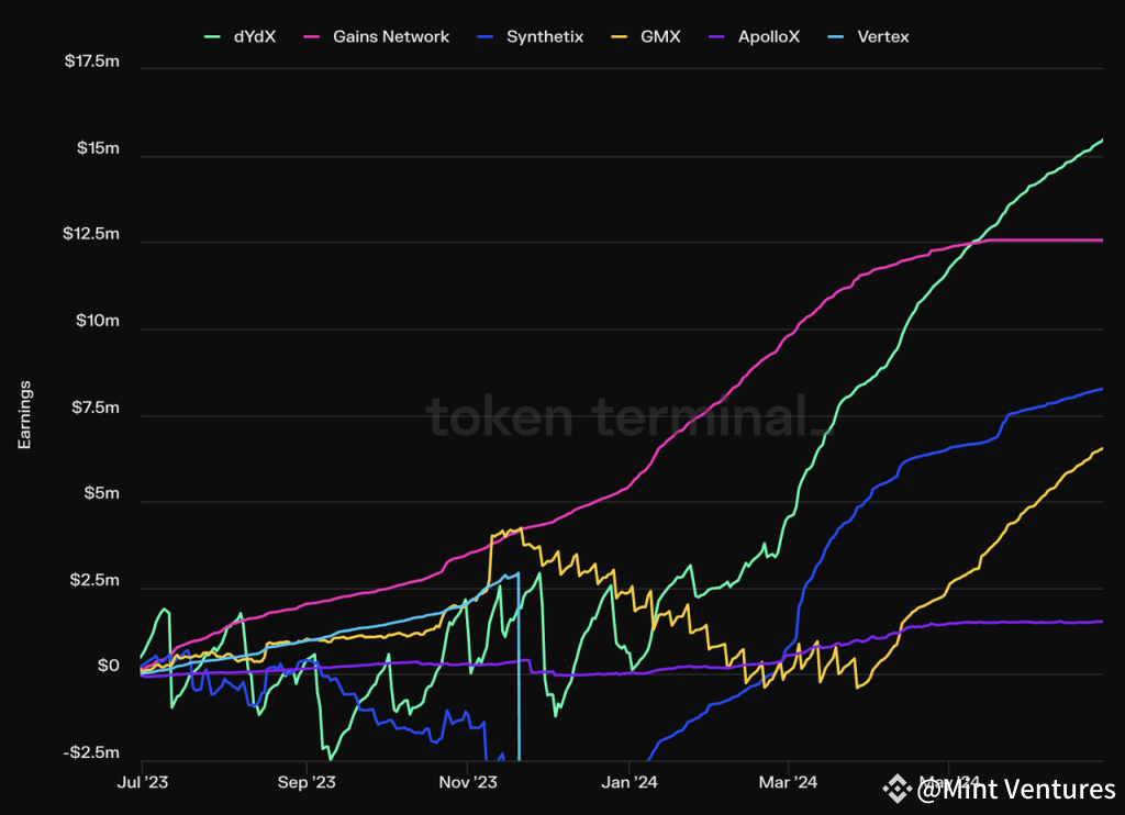 Looking at profit metrics, GMX recorded profits of $6.5 million in the past year, which are less than those of competitors such as dYdX, GNS, and SNX. However, it is critical to understand that this figure was significantly impacted by GMX’s decision to release all 12 million $ARB tokens rewards during the Arbitrum STIP event from November 2023 to March 2024. These tokens had an estimated value of $18 million, based on ARB’s average price at the time, which notably diminished the reported profits. Despite this, the trend in profit accumulation proves GMX’s robust ability to generate profits.