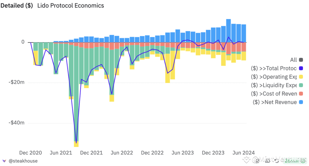Regarding its business model, Lido retains 10% of the staking revenue it generates, allocating 5% to staking service providers and managing the remaining 5% through its DAO.