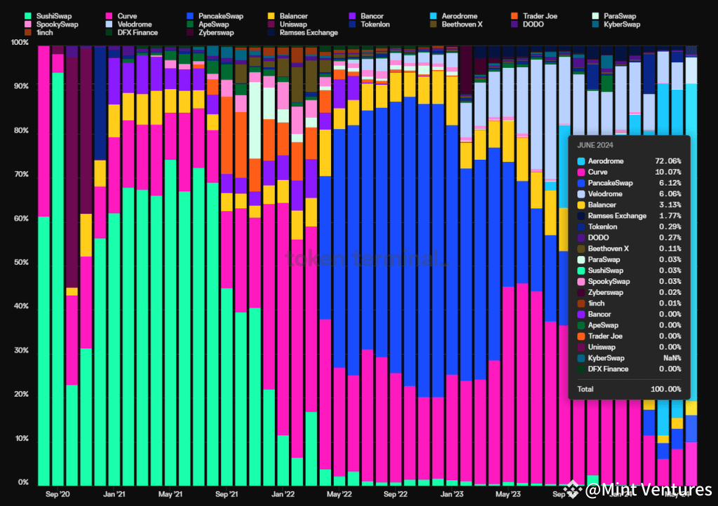 The chart below illustrates the monthly incentives of major DEXs. It can be observed that Sushiswap, Curve, Pancakeswap, and Aerodrome, a project adopts ve(3,3) model and built on Base, all of which at one point had the largest subsidy amounts. However, none of them have managed to secure a higher market share than Uniswap.