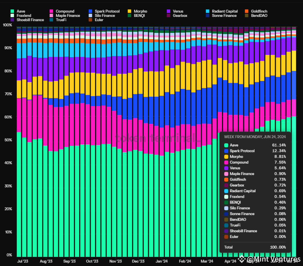 The chart below illustrates Aave’s market share in terms of active loan sizes over the last year. Aave’s proportion of active loans has been on an upward trajectory for the past six months, now claiming a significant 61.1% market share. It’s important to note that this percentage might be understated. The graph inadvertently includes a double count of the loan volumes attributed to Morpho’s optimizers which operate on both Aave and Compound.