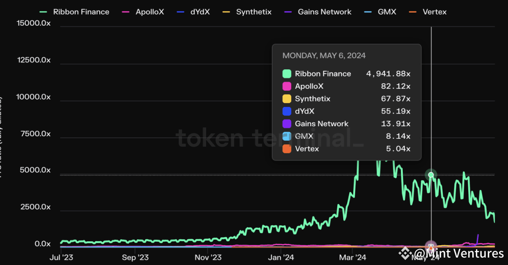 When considering the PS ratio, GMX stands out for its relatively low valuation in the segment of projects that have issued their tokens, focus on perpetual trading and have an average daily trading volume of over $30 million. The only competitor with a lower PS ratio is Vertex, which continues to engage heavily in trade mining incentives.