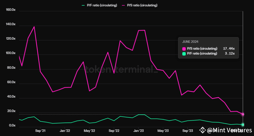 Despite a modest dip in market share, Lido’s staking volume has continued to expand, propelled by an increasing overall staking rate of $ETH. Valuation-wise, Lido’s Price to Sales (PS) and Price to Fees (PF) ratios have recently hit all-time lows.