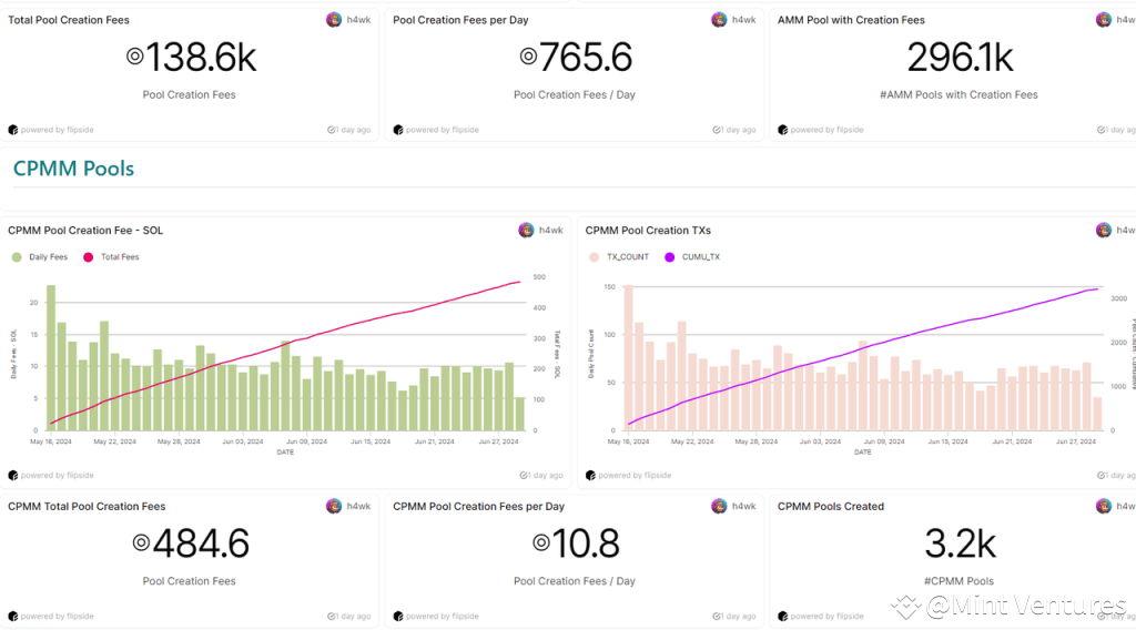 Besides trading fees, Raydium charges for creating new pools: 0.4 SOL for a standard AMM pool and 0.15 SOL for a CPMM pool. Raydium’s daily earnings from these pool creation fees average around 775 SOL. Calculated at the $SOL on June 30th, 2024, the total revenue should be $108,000. These funds are directed towards protocol development and maintenance, serving as operational income for the team, rather than being deposited into the treasury or used for $Ray buybacks.