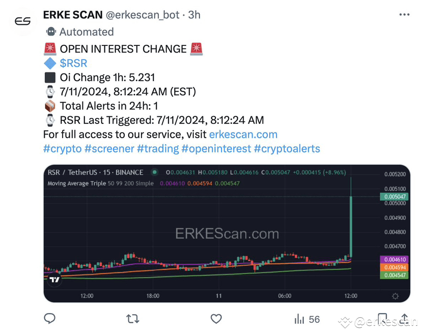 ERKEScan triggered an alert for a significant increase in Open Interest (OI Change 1h: 5.231). This alert indicates a substantial number of new positions being opened, suggesting strong market activity.