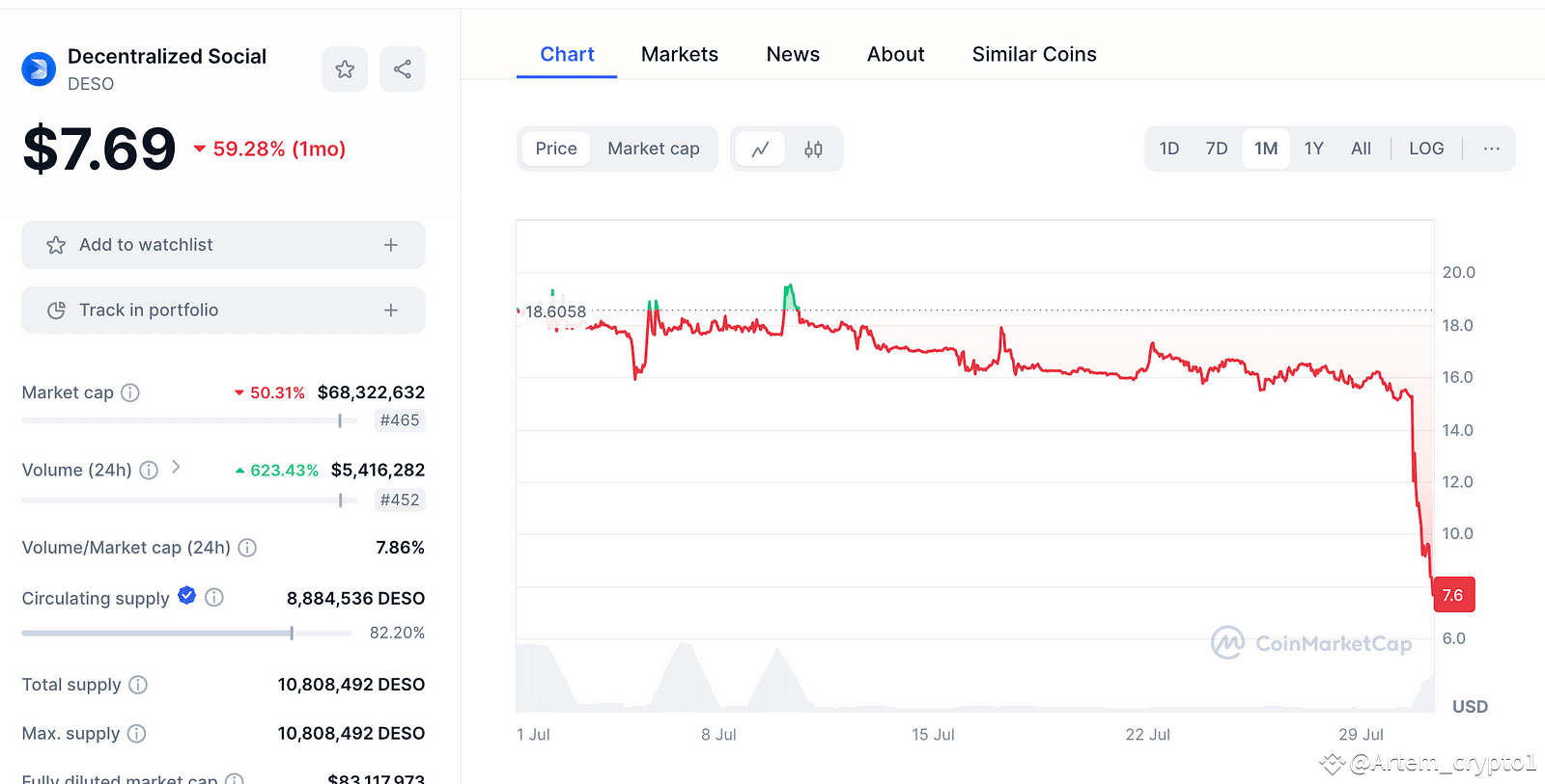 After the announcement, the $DeSo token took a big dive.