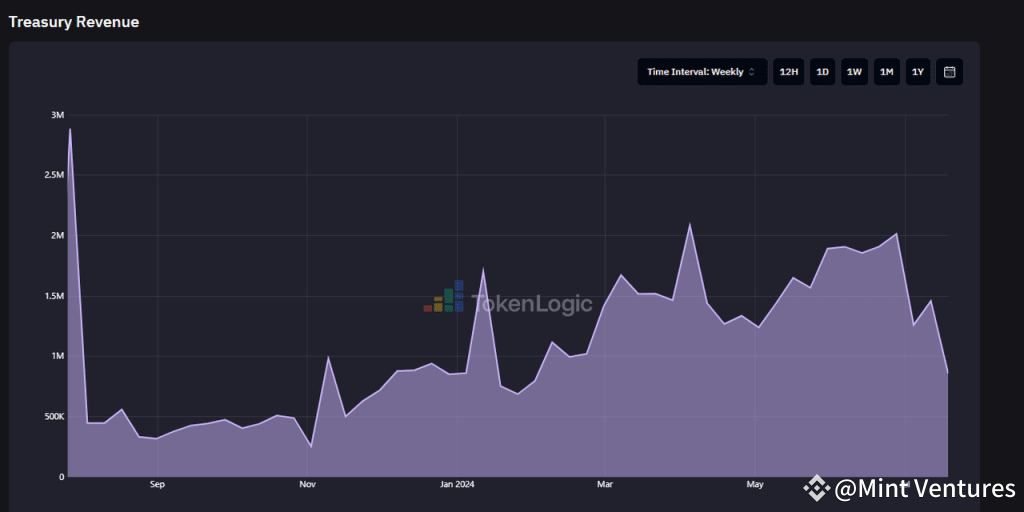 The decrease in sell pressure is due to the phasing out of the staking module, implying that Aave will utilize stablecoins and ETH from protocol revenues for expenditures, instead of issuing new $AAVE tokens. This shift will reduce Aave’s market pressure and enhance its scarcity.