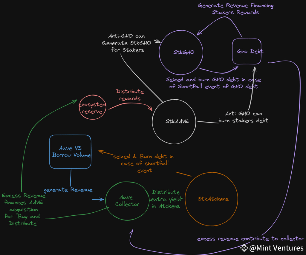 Staked $AAVE yields “Anti-GHO,” which can be used either to repay GHO debts or directly deposited into the GHO staking module, thereby enabling $AAVE stakers to also benefit from the profits generated through GHO.
