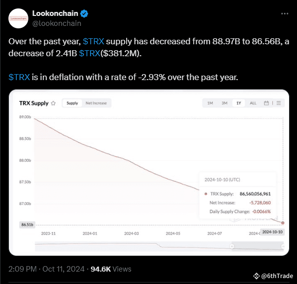 In the past year, the total circulating supply of TRX has dropped by 2.41 billion tokens, valued at approximately $381.2 million based on current prices. This reduction, reported by the analytics platform Lookonchain, marks a significant shift toward deflation. The supply of TRX has decreased from 88.97 billion to 86.56 billion coins, translating to a notable deflation rate of -2.93% over the last 12 months.