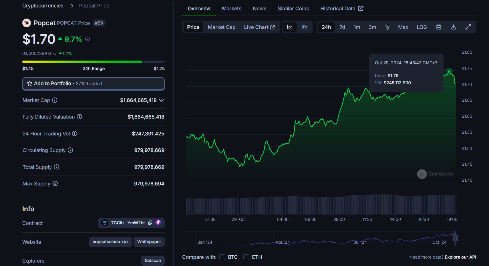 Popcat (POPCAT), the popular memecoin on Solana, has just set a new record high of $1.75, with a gain of more than 14% in the past 48 hours, leading the strong rally of Solana-based memecoins.
