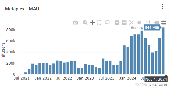 As of the writing of this article (November 30, 2024), the latest monthly active user count for Metaplex has reached 844,966, setting a new all-time high for a single month and representing a year-over-year growth of 253%.