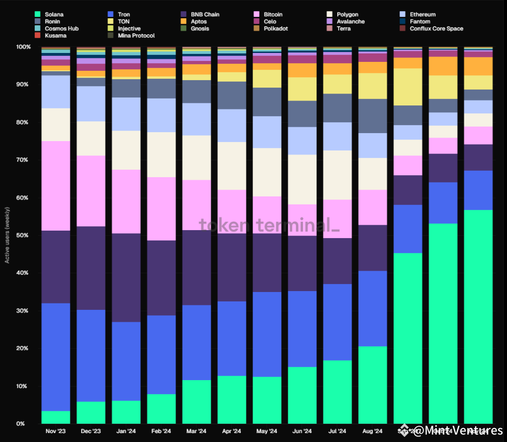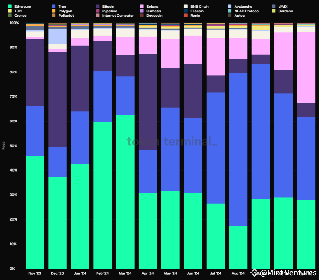 Fees: Solana’s fee revenue share grew from 0.62% to 28.92%, representing a year-on-year increase of 4564%.