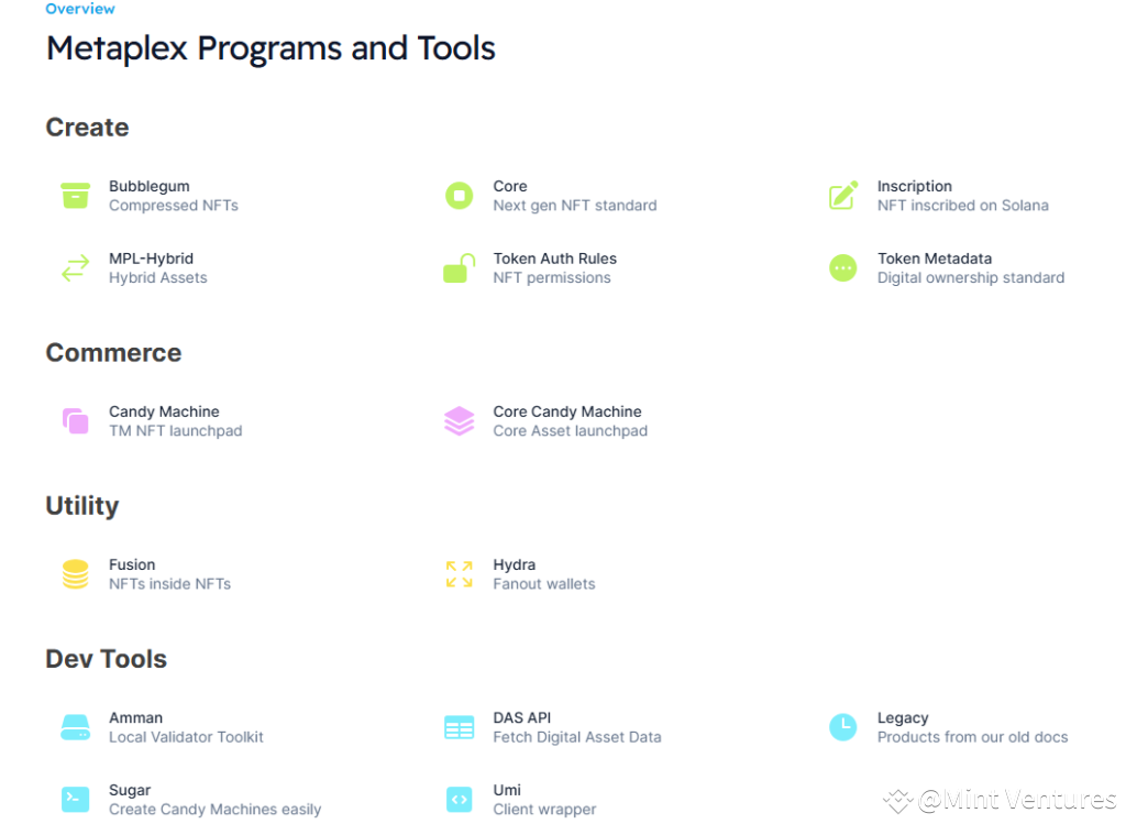 Metaplex, as a system for asset issuance, management, and standardization, supports both NFTs and fungible tokens (FTs) as its target asset types. The following products form a comprehensive matrix designed to serve assets within the Solana ecosystem.