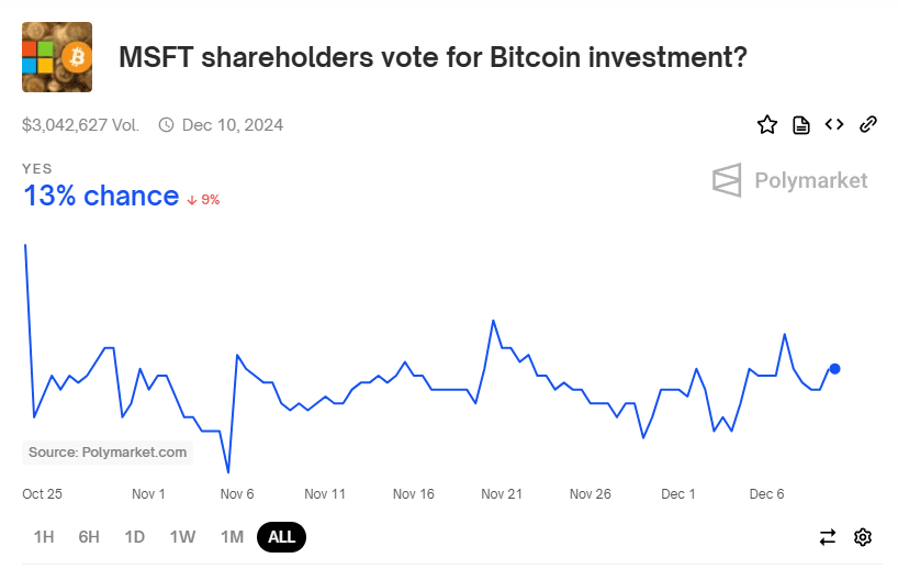 Meanwhile, regarding whether Microsoft will support the proposal, Polymarket data predicts that there is only a 13% chance that shareholders will vote in favor, with $2.99 million already bet.