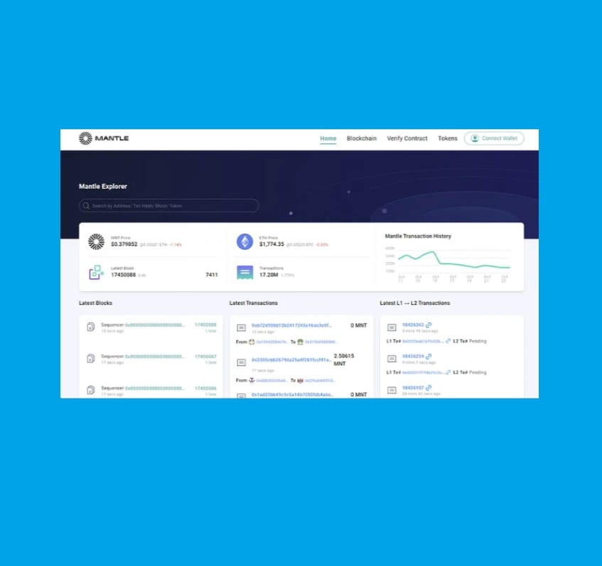 Mantle Block Explorer is a blockchain exploration tool that helps users search for transactions, blocks, addresses, and other information on the Mantle network. The tool has a user-friendly interface, easy to use and intuitive.