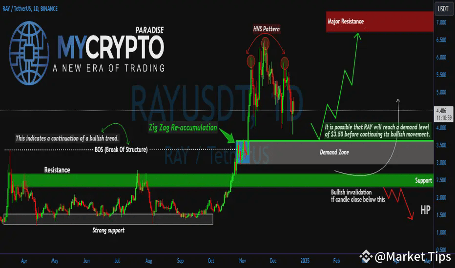 💎#RAY is currently forming a bearish Head and Shoulders (H&S) pattern, signaling a potential downward move if the pattern breaks successfully. The initial target in this case would be the $3.5–$3 demand zone, a critical level where buyers could step in and push the price back up significantly. If this rebound occurs, the next major resistance zone could serve as a strong upside target.
