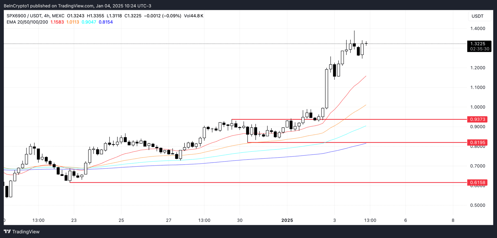 SPX has hit an all-time high, with a market cap of $1.22 billion, placing it among the top 100 altcoins. The coin is up 63% over the past seven days, showing strong bullish momentum despite a 27% drop in trading volume over the past 24 hours.