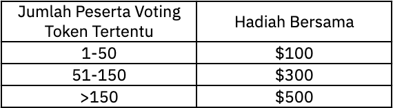 Example: During the first week of the campaign, a campaign with theme X with 4 token options has the following polling results: Token A: 120 votes, Token B: 50 votes, Token C: 300 votes, Token D: Token 200 votes. If during the one week duration, it turns out that Token A has the highest percentage increase in price, then the total prize will be distributed equally to participants who choose the token based on the prize mechanism in the table.