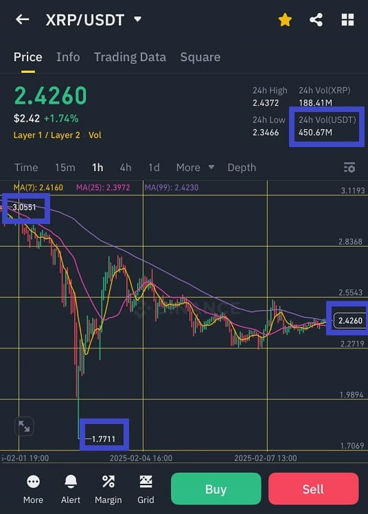 ➢ $XRP has had some notable swings recently! It opened February at $3.05 but soon dropped to $1.77. Then, it made a surprising rise to $2.78. Currently, it seems to be picking up pace again, sitting at $2.42 and trending upwards.📊